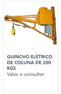 Em termos de especificações técnicas, o Guincho Elétrico de Coluna de 200 Kgs apresenta as seguintes informações: